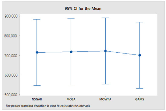 The confidence interval of 95% for algorithms is also illustrated in Figure 5. According to the fact that intervals cross each other, we can statistically conclude that the obtained results from metaheuristic algorithms are equal to the obtained results from GAMS. Therefore, the proposed algorithms are capable of finding globally optimum solutions and are also an appropriate case for large-scale problems.