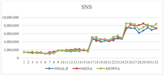 After proving algorithm efficiency, large-scale problems are applied to evaluate algorithm performance in finding near-optimum solutions for large-scale problems. To analyze the results, we selected 32 samples which are placed in four categories regarding the number of suppliers, cross-docks, factories, and transportation vehicles. The first group includes problems with 3 suppliers, 4 cross-docks, 5 factories, and 7 transportation vehicles. The second group includes problems with 6 suppliers, 5 cross-docks, 7 factories, and 9 transportation vehicles. The third group includes problems with 8 suppliers, 7 cross-docks, 9 factories, and 11 transportation vehicles, and the fourth group includes problems with 10 suppliers, 9 cross-docks, 11 factories, and 13 transportation vehicles. Eight random samples are generated for each group. Then, the performance of the proposed algorithms is evaluated based on comparison criteria. In Figure 6, the proposed criteria are calculated and illustrated for all of the generated random problems. Additionally, Figure 6 represents algorithm efficiency in the SNS criterion. Since the less the SNS, the better it is, NSGA-II has the best performance among all the other algorithms. Furthermore, in smaller size problems, all of the algorithm’s efficiencies are similar to each other.