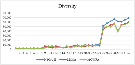 Figure 8 shows algorithm efficiency for the Diversity criterion. NSGA-II still stands on the first stage for this criterion.