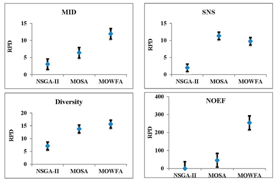 where i is the algorithm number and j is the example number. To determine algorithm efficiency, we use the confidence interval of 95%. The obtained results are illustrated in Figure 10. The results show that in the SNS criterion, the NSGA-II algorithm performs significantly better than the two other algorithms. Although the MOSA and MOWFA algorithms are similar to each other in terms of results, the MOSA and NSGA-II algorithms are also similar in terms of MID. In this criterion, MOWFA has the worst performance. In the Diversity criterion, NSGA-II performs far better than MOFA and MOWFA. MOSA and MOFA are also similar to each other in terms of statistics. However, MOSA performs better than MOWFA. In the computational time criterion, MOWFA performs worse than the other two algorithms. In this criterion, NSGA-II has the best performance.