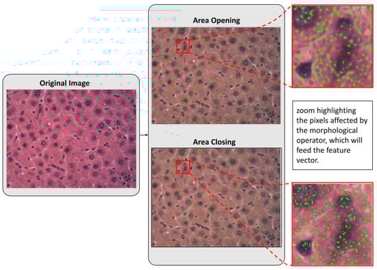 Deeply analyzing the literature, we still found one more work closely related to this one. Thiran and Macq [] performed morphological feature extraction for the Classification of Digital Images of Cancerous Tissues. The authors used a dataset composed of images from lungs and digestive tract obtained by biopsy. The proposal was based on the use of mathematical morphology to segment the nuclei of the cell, as the shape is an important attribute to make it. The sequence of operations used to perform this segmentation was the following: morphological opening, morphological reconstruction, and lastly, a threshold. Once the nuclei was segmented, the set of features was extracted using, once again, morphological operations to capture measures related to Nucleocytoplasmic Ratio, Anisonucleosis, Nuclear Deformity, and Hyperchromasia. Finally, they proposed a score obtained from these four values and used it to decide whether a given tissue is cancerous or not.