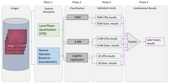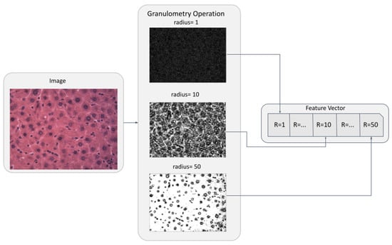 As far as we know, the automatic identification of cancer, using a spectral texture descriptor and granulometry-based properties of the tissue taken from the liver, is proposed for the first time in this work. Furthermore, we also investigate the complementarity between classifiers created on both scenarios (i.e., the LPQ texture operator [], and a granulometry-based descriptor [,,]). The experimental results demonstrate the existence of a high level of complementarity between both on the task evaluated here.