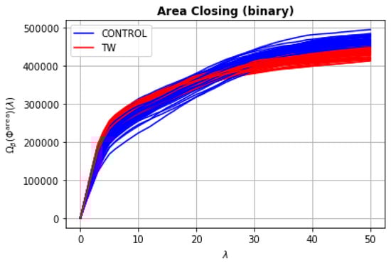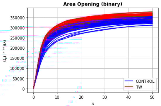 Figure 5 and Figure 6 show two sets of binary size distributions computed for each image from the dataset introduced in Section 3. In this example, 120 binary size distributions were computed: the blue curves are related to control images; the red ones are related to the Walker 256 tumor images.