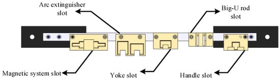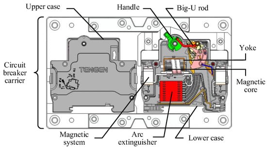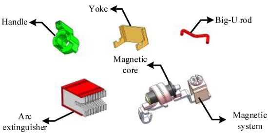 The internal structure and the components are shown in Figure 1. In this paper, the handle, the big-U rod, the magnetic yoke, the magnetic system (including a magnetic system rack and a magnetic core), and the arc extinguisher are selected as the objects (as shown in Figure 2) to be assembled by a single robot.