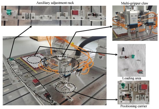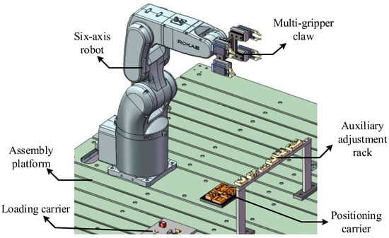 A flexible switch control method is proposed. An auxiliary adjustment rack for all parts is designed. The work platform that adjusts random postures of the parts to the specified postures is shown in Figure 3, including a six-axis robot, a flexible multi-gripper claw, an MCB assembly platform, a loading carrier, a positioning carrier, and an auxiliary adjustment rack.