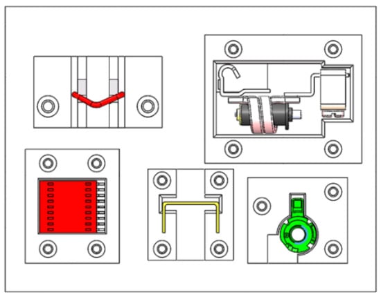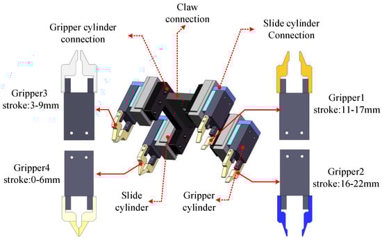 Figure 4 shows the designed flexible multi-gripper claw on the robot. Four grippers with different strokes (11–17 mm, 16–22 mm, 3–9 mm and 0–6 mm, respectively) are designed to match different sizes and assembly requirements of the parts. To effectively hold parts of different sizes and shapes, the ends of the grippers are in specified shapes. The width of the clamping position for the yoke and the magnetic system rack is 1 mm, and that for the big-U rod is 1.2 mm. The connections between the end effector, slider cylinder, and gripper cylinder are also designed. In an adjustment process, the robot automatically chooses a gripper whose stroke range matches the size of the part.