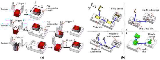 Based on the robot assembly platform and the corresponding mechanism shown in Figure 3, Figure 4 and Figure 5, this paper proposes the following flexible assembly method and process of the MCB. Specifically, the arc extinguisher is adjusted by the gripper 1 and 2, the magnetic yoke is adjusted by gripper 3 and 4, the big-U rod is adjusted by gripper 4, and the magnetic system is adjusted by gripper 3 and 4, and the handle is coordinated by gripper 3 and 4. Taking the posture adjustment of the arc extinguisher as an example, the postures are categorized into three situations. The specified process that uses gripper 1 and 2 to adjust the arc extinguisher is shown in Figure 6a. In the case of posture 1, it is rotated around the Z axis by a certain angle by gripper 2, and then placed in the arc extinguisher slot on the positioning carrier. In the case of posture 2, it is clamped by gripper 1 and rotated counterclockwise around the Y-axis and clockwise around Z-axis, and then placed into the auxiliary adjustment rack. Finally, gripper 2 is applied to put it into the arc extinguisher slot. In the case of posture 3, it is clamped by the gripper 1, rotated clockwise around the Y-axis and counterclockwise around the Z-axis, and then placed into the auxiliary adjustment rack. Finally, gripper 2 is applied to put it in the arc extinguisher slot after rotating it around the Z axis.