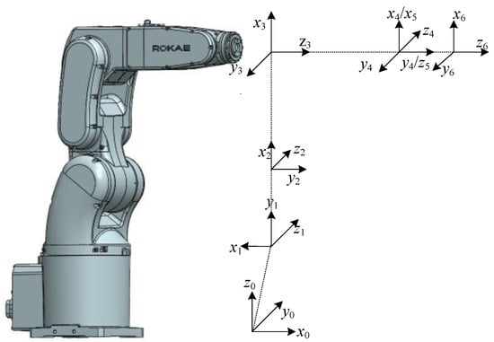 In Figure 8, (xi, yi, zi) (I =1,2,3,4,5,6) represent the coordinate system of each joint, while (x0, y0, z0) represents the base coordinate system.