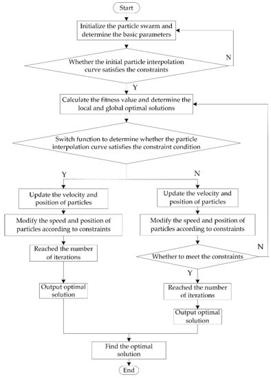 As shown in Equation (13), the fitness switch function conditionally selects the particle fitness in segments. If the velocities of the three segments meet the constraints of Equation (12), the fitness calculation of f1(t) in Equation (13) will be performed and followed by iterations; otherwise, the particles will be re-constrained and optimized based on the constraint conditions of equation. To guarantee the stability of the interpolated curve, the velocities are reduced until the requirements of f2(t) in Equation (15). Equation (15) represents the seven calculation situations of f2(t). Aiming at the above-mentioned seven conditions of inconformity, the time variables e1, e2, and e3 are employed. The fitness switch function sifts and categorizes the particles into two types: superior particles which meet all constraints and can be directly optimized for iterations (the “Y” branch); inferior particles which cannot fully meet the constraints and need to be modified before the iterations (the “N” branch).