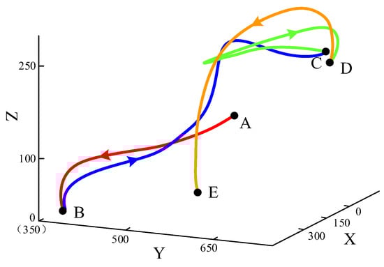 As shown in Figure 10, the flexible assembly performed of MCB parts can be divided into four operating sections: section AB represents the robot moving from the initial position to the loading area; section BC represents the robot gripping a part and placing it on the adjustment rack; section CD indicates the robot adjusting the part to a fixed posture for assembly on the adjustment rack; section DE indicates the robot arm placing the adjusted part on the positioning carrier.