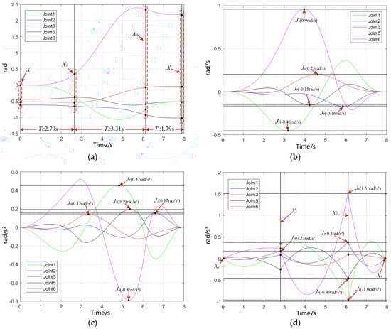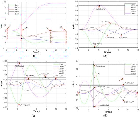 The position, velocity, acceleration, and jerk interpolation curves of the six joints calculated by the first quintic polynomial interpolation are shown in Figure 11. In Figure 11, The oscillations of the position, speed, and acceleration curves are expected to be continuous and smooth. Meanwhile, the maximum values of the speed, acceleration, and jerk oscillations are expected to be as close to the constraint values as possible, to achieve a higher performance. Figure 11a shows that the quintic polynomial interpolation curve passes the given interpolation points X1, X2, X3, X4 and is continuously smooth during t1, t2, and t3, which proves the effectivity of the fifth-degree polynomial interpolation. Figure 11b–d show that the unoptimized speed, acceleration, and jerk curves are continuous, and the peaks meet the constraints Table 4, but the maximum values of the oscillations are much smaller than the constraint values.
