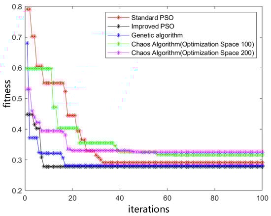 To compare and verify the optimization results, the proposed optimization algorithm is compared with the standard PSO, genetic algorithm (GA), and chaotic optimization algorithm (COA). The chaotic optimization algorithm designed two different optimization spaces, and the comparison results are shown in Figure 12, which shows that the improved PSO converges to the optimal at the 8th iteration, the standard PSO converges to the optimal value at the 33rd iteration, the genetic algorithm converges to the optimal at the 17th iteration, and the COA with optimization space sizes of 100 and 200 converges to the optimal value at the 20th and 56th iteration, respectively. Hence, the improved PSO is about 76% faster than the standard PSO, 53% faster than the genetic algorithm, and 60% and 85.7% faster than the chaos algorithm. According to the fitness, the improved PSO raises the optimization accuracy by 1.1%, 4.4%, 15.7%, and 12.2%, respectively, compared with other algorithms. Since the chaos optimization algorithm decreases significantly as the optimization space increases, the improved PSO has significantly improved convergence speed and convergence accuracy when the optimization space increases compared to the chaotic algorithm.