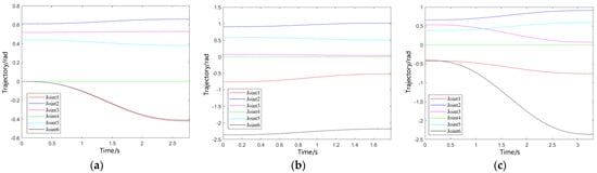 where j is the joint number (j = 1,2,3,4,5,6). The unknown coefficients aj1i, aj2i, and aj3i are the i-th coefficients of the first, second, and third segment interpolation functions of the j-th joint trajectory. hj1(t), hj2(t), and hj3(t) respectively represent the quintic polynomial trajectory function of the j-th joint in the third segment, where the variable ti is the interpolation time, .