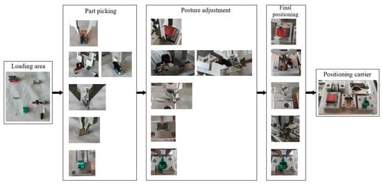 Figure 15 shows the experimental posture adjustment platform for flexible assembly, including a six-axis robot with a flexible multi-gripper claw, a positioning carrier, a loading area, an auxiliary adjustment rack, etc. Based on the flexible assembly process designed in Chapter 1, in the flexible assembly experiment verification, the mechanical arm clamps the MCB parts in random postures from the loading area. After the posture adjustment of the auxiliary adjustment rack, the part is placed in the positioning carrier in the final posture. The complete assembly process is illustrated in Figure 16, which illustrates the processes that the robot picks randomly postured parts from the loading area, places them in the corresponding adjustment slots on the auxiliary adjustment rack, re-picks them from the slots and lays them on the positioning carrier. Because of the different shapes of the parts, the trajectories for each part are different.