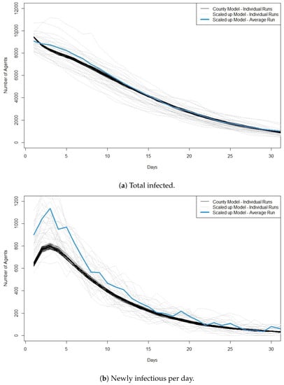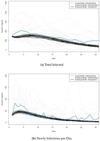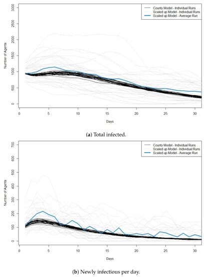 We then compare runs for scenarios with 1000 agents infected in the county model and 10 agents infected in the scaled up model. Although there is still significant variation in the scaled model compared to the county model, we see less variation in model runs than when we started with only three agents infected. Figure 2a,b plots for this second scenario the total infectious and the new infectious agents per day, respectively. We see that in the first approximately 5 days, the scaled model has higher peaks for new infectious cases compared to the county model and a slightly higher average for total. However, by 10 days, the average curve for the scaled model appears to match well with the runs for the original county model.