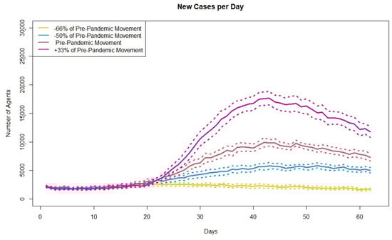 Plot showing the average simulated new cases per day across 30 runs for four different levels of movement. Dashed lines represent upper and lower bound of confidence intervals.