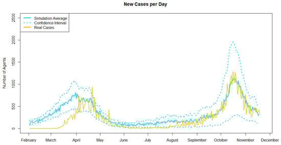 After cross validation, the next step to validate an agent-based model is to compare the output of the model to real data. To do this, we simulate the time between February and December 2020 in Ireland and compare the average model output across 30 runs to the real number of cases per day in Ireland. We start the model from 1 February 2020. There were no cases notified in Ireland until 29 February 2020; however, starting the model prior to the initial cases allows for a model burn-in period. At the start of the model runs, there are three infectious agents: one is asymptomatic, and one is presymptomatic. Two agents are exposed but not yet infectious, and all other agents are susceptible. We match all agent movements and intervention strategies to those that were in place in Ireland during that time period. Initially, schools are open and agents are mixing at regular pre-pandemic levels. In the third week of March, schools are closed. In the fourth week of March, a lockdown is introduced; agents reduce their mixing to approximately 50% of pre-pandemic levels and 70% of agents who would normally be working are either working from home or not working. In April, agents reduce their mixing levels again to about 17% of pre-pandemic mixing. Lockdowns and other restrictions start to lift by June, and thus agents increase their mixing to 33% of pre-pandemic levels in June. In the model, schools reopen in September, and agents remain at the same community mixing level. In the beginning of October, agents increase their mixing back to approximately 60% of pre-pandemic levels; however, movements are reduced to 33% of pre-pandemic levels in the last week of October, as a new lockdown is introduced in Ireland. At the start of December, the lockdown is lifted, and agents increase their movements to near pre-pandemic levels. Table 1, gives a summary of the dates that interventions were implemented and when agent mixing changed.
