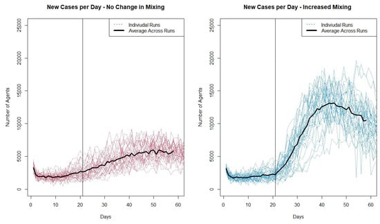 Looking at both plots, it can be seen that the increase in cases when schools reopen is much greater when the reopening coincides with an increase in agent movement in the community. The increased movement also appears to lead to a greater variation in individual runs as seen in Figure 6.
