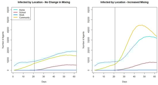 To test our model, we run an experiment to better understand how changes in movements can interact with other interventions or the lifting of measures and impact the pandemic in the short term. We perform 30 runs of two scenarios of the model that focus on the period of time when schools reopen in the autumn: (1) schools re-open and community mixing remains the same at a 50% lower rate of mixing than pre-pandemic levels (2) schools re-open and when schools reopen community mixing returns to pre-pandemic levels. We run the model for the equivalent of 60 days, starting a month before schools open and running for a month after schools open. The model is only run for a month after schools open to determine the immediate and short term impacts of opening schools. These are the impacts that will likely occur before an intervention is put in place. For each set of runs, we compare the total infected agents at a given time step and the number of newly infectious agents per day. As we did in the sensitivity analysis, we expect that increased movement and opening schools will lead to an increase in cases. Understanding the magnitude of the increase is important, and we can learn this from the model; however, simpler infectious disease models, such as the SEIR model, will also be able to model this increase in cases. To emphasize the importance of using an agent-based model and the additional information we can learn from a model that simulates at the individual level, we also look at the location of the infection (home, school, work or the community) and the age groups of those infected, and discuss possible implications from the model output.