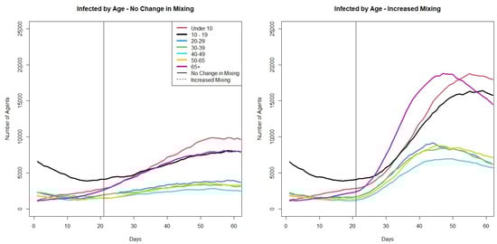 The model output can also be used to look at the age groups of those infected. Figure 8 shows the average number of infectious agents by age group across the 30 runs for the two scenarios. The age groups are 0–9, 10–19, 20–29, 30–39,40–49, 50–65, 66 plus. In the scenario where there is no change in community mixing when schools open while there is no considerable increase in the 20–65 year old age groups. However, when there is an increase in community mixing there is an immediate increase in cases in these age groups. In both scenarios, we see increases in the under 10 age group, the 10–19 age group and the over 65 age group. The increase in all three age groups is greater when community mixing increases. The increase in the over 65 group along with the student population is an interesting outcome from opening schools, especially as the cases in the other adult age groups do not increase in the no-change-in-mixing scenario. One possible reason for the increase in the over 65 population as schools open is that the grandparent caring that is built into the model. This could lead to the direct increase in transmission between children and the elderly that is seen in the model output. When the increase in cases due to schools opening in the over 65 age groups is paired with an increase in community mixing, we see the highest cases in any age group in the over 65 group.