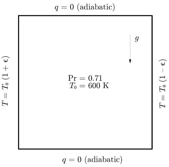 The definition of this problem is taken from [46,47]. The flow in a closed square cavity is impulsed by the temperature difference between the vertical walls (see Figure 1). The dimensionless parameters that define this problem are the temperature semi-difference, defined as