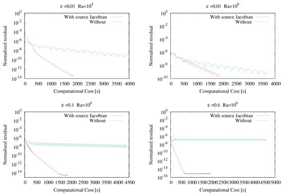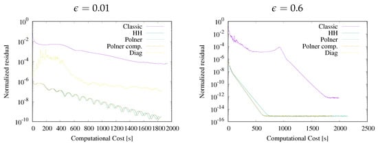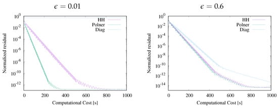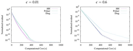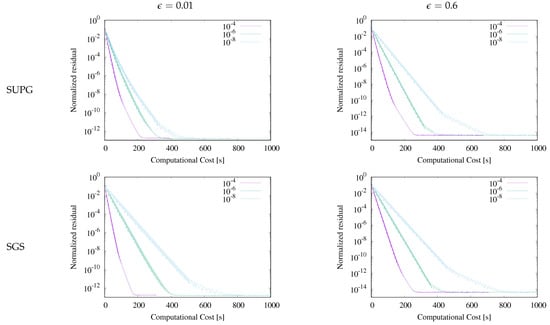 Figure 3 compares, for the Boussinesq model and the SUPG finite element method, the residual convergence of the incompressible stabilization matrices. From the results, one can conclude that the diagonal tau should be avoided, since, for the given computing parameters, it does not converge for small . Again, this result stresses the importance of off-diagonal terms [13,35]. For any , the HH and Polner taus show a similar behavior. For the incompressible model, recall that the compressible Polner tau is the same as the Polner tau.