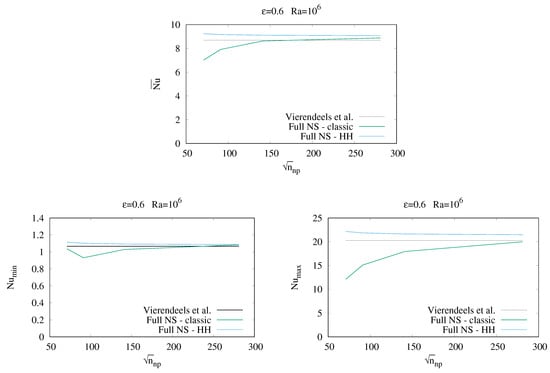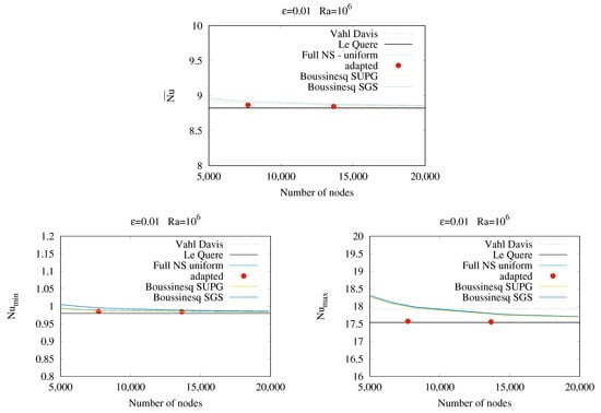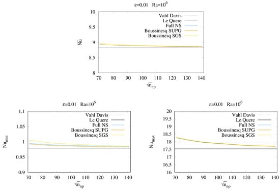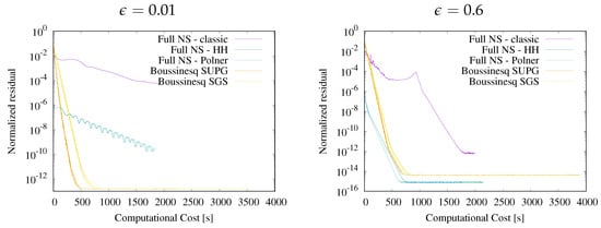 Finally, Figure 6 compares the residual convergence for various models and methods. For the Boussinesq model, both SUPG and SGS with either the HH and the Polner taus, behaved similarly; SUPG perhaps showed faster convergence than SGS for small . Regarding the full Navier–Stokes equations, both HH and the Polner tau behave identically and produce a faster convergence than the classic tau, although the classic tau improves convergence as the temperature difference is increased. Note that, for the same computing parameters and small , the Boussinesq model converges faster than the full Navier–Stokes equations. This advantage tends to disappear as is increased.