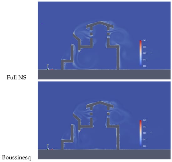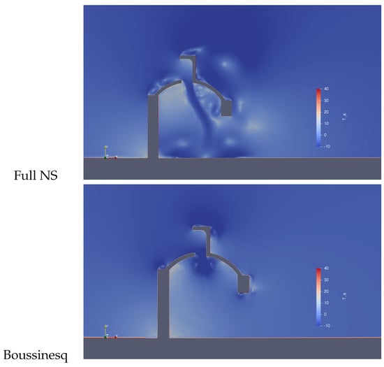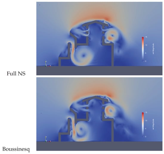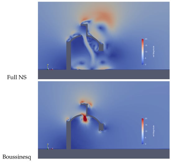 Figure 23 and Figure 24 compare the velocity and apparent temperature fields obtained with the full Navier–Stokes equations and the Boussinesq model. As above, the full Navier–Stokes solution shows larger eddies with somewhat smaller maximum velocities and larger temperature spreading.