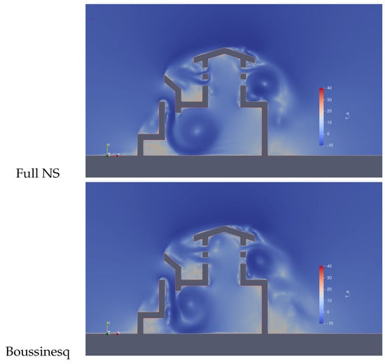 Wind tower 2. Apparent temperature field obtained by the full NS and the Boussinesq model with m/s.