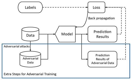 Adversarial training expands on conventional training methods by adding an extra step into the training procedure, as illustrated in Figure 2. In this way, the model can generalize both clean data and the adversarial data generated by the attack methods utilized in the adversarial training. Therefore, the robustness of the model is improved against adversarial attacks.