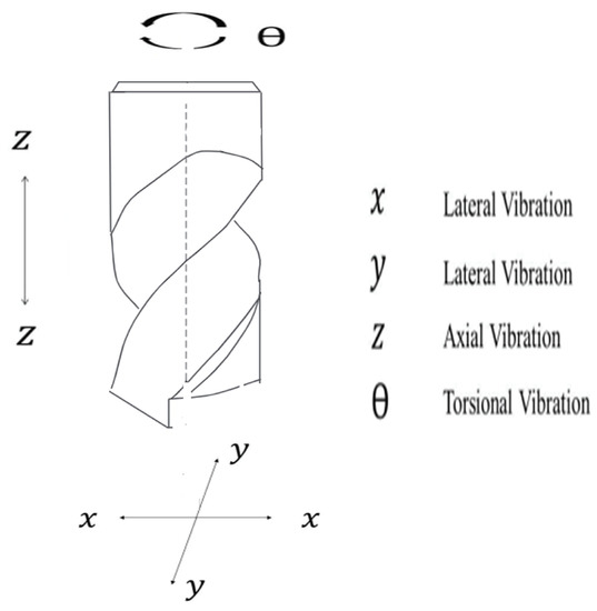 The vibration in the drilling tool system can be resolved along three components (4 DOF), which is shown in Figure 1.
