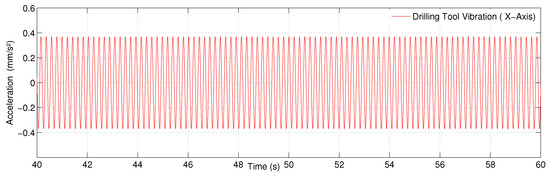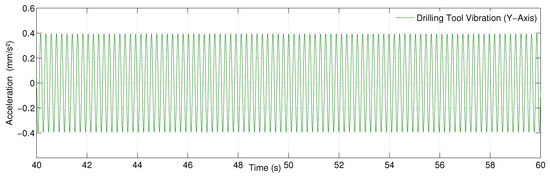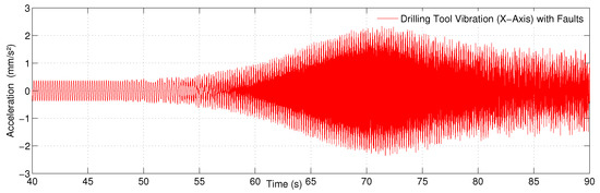 The entire drilling mechanism is simulated using the software platform Matlab/Simulink. The events of faults demonstrated using simulation are presented and consequently validated the fault detector scheme for successful detection of faults. For the drilling process model, two subsystem Simulink blocks are used. One block with the defect and the second block without the fault are used to compare the findings. Control signals and cutting forces are the process model’s inputs. The simulation time was set for a period of 120 s. The IT2-FLS toolbox designed by Taskin et al. [57] is implemented in order to actuate the simulation process. The important features of the IT2-FLS toolbox are the main editor, membership function editor, rule editor as well as the surface viewer. The membership functions considered for the entire process are the Gaussian functions. Designing the type-2 fuzzy system, we first use the type-2 fuzzy logic system toolkit [57]. The computing cost of calculating the type-2 fuzzy system output is high due to its iterative nature [58]. To deal with these conditions, many TR approaches for decreasing the computational cost of the type-2 fuzzy inference mechanism have been presented. In the fuzzy logic theory, the Karnik–Mendel (KM) algorithms are iterative techniques.They are known to converge monotonically and super exponentially quickly; however, convergence requires several (typically two to six) iterations [59]. The TR methods were divided into two categories by Wu: Enhancements to the KMs, which reduced the KM’s computational cost, and Alternative TR approaches, which are closed-form approximations to the KM algorithm [60]. Because of its novelty and adaptability, the KM approach is the most popular [61]. A type-2 fuzzy logic system toolbox supports type reduction and defuzzification procedures: (1) Karnik–Mendel Algorithm (KM); (2) Enhanced KM Algorithm (EKM); (3) Iterative Algorithm with Stop Condition (IASC); (4) Enhanced IASC (EIASC); (5) Enhanced Opposite Direction Searching Algorithm (EODS); (6)Wu–Mendel Uncertainty Bound Method (WM); (7) Nie–Tan Method (NT); and (8) Begian–Melek–Mendel Method (BMM). It is possible to state the antecedent MFs using the MF types that currently exist in the Matlab Fuzzy Logic Toolbox in the type-2 fuzzy logic system toolbox. As a result, the LMF and UMF Matlab functions can be implemented in the same style. However, each type of MF has an additional parameter that represents the height of the related MF. A triangle MF, for example, is defined by the parameters A2, B2, C2, and H2, which specify the MF’s left point, centre point, right point, and height, respectively. In type-2 fuzzy systems, especially type-2 fuzzy controller design, the parameter H2 is commonly used to produce FOU. Gaussian functions are used for the membership functions. Gaussian membership functions have the advantage of being easier to design since they are easier to express and optimise, they are always continuous, and they are faster for small rule bases. When the same number of MFs and the same type-reduction and defuzzification approach are utilised, Gaussian type-2 fuzzy logic systems are faster than trapezoidal type-2 fuzzy logic systems. Because small rule bases are commonly employed in practise, Gaussian type-2 fuzzy logic systems appear to be more cost-effective. The type-2 fuzzy system is defuzzified by implementing the technique proposed in [36]. The fuzzy laws are chosen on the basis of Theorem 1 concentrating on the condition The learning rate used for the fuzzy laws is The conditions extracted from Theorem 2 for the fault detector estimator are and . In Figure 6 and Figure 7, the drill tool’s vibration is plotted on the x and y axes. For better clarity of the plot representation, a 20-s interval is shown. These vibration graphs show the pattern of vibration in the absence of induced flaws. At 45 s following the commencement of the drilling process, an artificial fault is induced along the x and y axes to the drilling operation simulation. The vibration of the drill tool with the induced flaws is represented by Figure 8 and Figure 9. These plots show how plots with chatter change after 45 s, proving the fluctuation of vibration caused by induced faults. The period between 40 s and 90 s is illustrated for the clarity of the charts.The induced fault is a self generated sinusoidal signal. The defect detection in the drill tool is shown in Figure 10 and Figure 11 along x and y components. The charts show that there is no change in the signal until 45 s, when it displays zero. At the instant of the detection of fault, the change in vibration signal is detected instantly along x and y components. From the vibration plots with induced faults (Figure 8 and Figure 9), it is clear that the intensity of the faults increases after a period of 65 s. However, from the fault detection estimator, the variation of the plots is noticed instantly with the fault starting up, thus raising an alarm and preventing the damage of drill tool. Hence, it is validated that the interval type-2 (IT2) Takagi–Sugeno (T–S) fuzzy based observer fault detection algorithm is successful as a fault detector mechanism by the sounding alarm after a period of 45 s. The future work is intended towards the investigation of faults along z and directions and comparing the results with x and y directions, thus predicting remaining useful life (RUL) of the drilling process system.