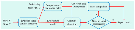 For 5D conflict detection, we notice that when Condition 1 defined in Section 3 is satisfied, in the five fields, up to ten () types of two-field (i, j) combinations exist to satisfy Condition 2 defined in Section 3. To determine the two fields to satisfy Condition 2, an extremely complex execution process is required. Moreover, since the fields of filters are stored in different data formats, it is difficult to design an effective data structure and algorithm to detect all conflicts. Therefore, if the existing algorithms are extended to detect 5D conflicts, the performance of most of them will be seriously affected. In order to simplify conflict detection, the key idea of our study is to divide the conflict detection into the detection of prefix fields and detection of non-prefix fields. We firstly analyze the comparison result combinations of filters F and G in prefix fields, then match them with the combinations of non-prefix fields of F and G to report conflict with our pre-computed information, which can reduce the number of comparisons of non-prefix fields and further speed up the execution of 5D conflict detection.