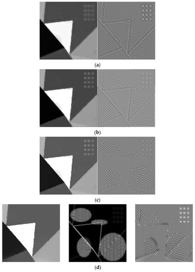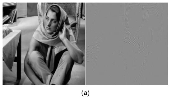 The first term in (12) contains an edge indicator function and when , , it can preserve edges; when , then , it can remove some small details. The second term in (12) is the norm for describing the texture. The third term in (12) is a residual term. Compared with [11,39,40], mathematically, the proposed model is more suitable for image decomposition.