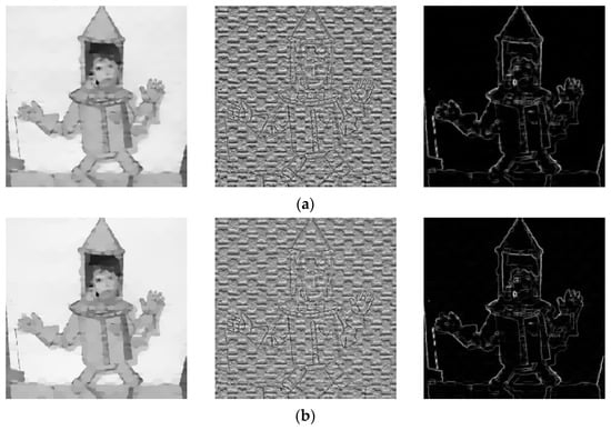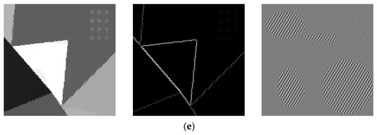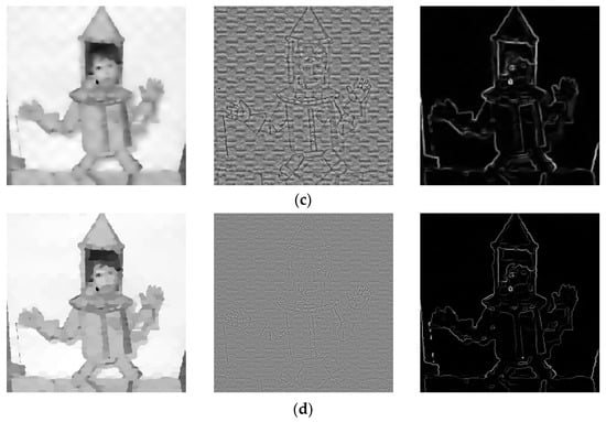 Figure 4 takes Fabric as the tested image, and the experimental parameters are taken respectively. Those parameters in [8] are manual mediated to achieve good results, which are selected . The parameters in [39] are . For the parameters in [40], are chosen. From Figure 4a–d, we can see that the texture images in Figure 4b,c contain more contours which should be retained in the cartoon image. However, these characteristics are not obvious in Figure 4a,b. In addition, from the perspective of vision, the separated cartoon by the proposed method is better than [8]. For the pseudo edge image in Figure 4, we can observe that the obtained pseudo edge using [40] doesn’t match the cartoon image.