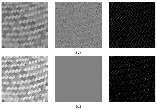 The decomposition results using different algorithms. From left to right: (a) Cartoon, texture and the module of gradient for the cartoon obtained by [8]. (b) Cartoon, texture and the pseudo edge obtained by [39]. (c) Cartoon, texture and the pseudo edge obtained by [40]. (d) Cartoon, texture and the pseudo edge obtained by the proposed method.