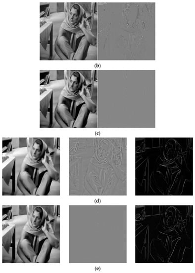 In Figure 5, we take Barbara image to test the different methods. The experimental parameters are . The parameters in [15,40] are and respectively. From the decomposed cartoon images, we can observe that the cartoon image in Figure 5a contains some textures which are not extracted in the upper right area; the cartoon image in Figure 5d is smoother than other cartoon images. For the decomposed texture images, we can observe that the texture in Figure 5b is enhanced, and the texture in Figure 5d contains more contour structure which should be in the cartoon. Relatively speaking, the proposed method achieves better results. For the pseudo edge images in Figure 5d,e, we can see that the pseudo edge image in Figure 5d is not consistent with the cartoon image in Figure 5d, which can be seen from the neckline area of the Barbara image, while the proposed method better consistent with its cartoon image which can be seen from the Figure 5e.