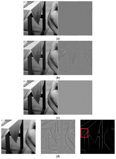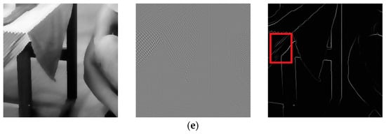 Figure 6 displays the decomposition results for Table image, which has a high presence of texture combined with cartoon parts. The parameters in [8,12] are chosen and respectively. The decomposition results in [26] can be run from the author’s homepage, the scale is chosen 3 to reach the best result in their homepage. The parameters are for the proposed method. Visually, the cartoon images in Figure 6a,b are more blurry; [26,40] smooth the non-textured part, such as the legs and the arm; the texture image in Figure 6c is relative good; for the pseudo edge images in Figure 6d,e, the new method obtain the better results which can be observed from the red rectangular area. In a word, the new model performs comparable results with the other methods.