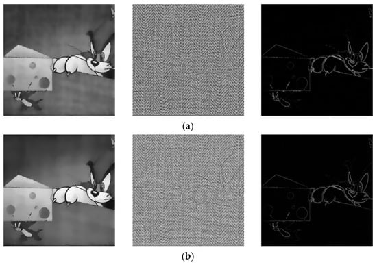 Figure 7 and Figure 8 are the experimental results for Tom and Boy images, respectively. The parameters are and for the proposed method, respectively. The parameters are chosen to get the better results in [11]. The parameters are and in [39], respectively. The parameters are in [40] and , respectively. Because [11,39] mainly studied image restoration, the residue denote the texture. Form Figure 7 and Figure 8, we can see that the cartoon images and the pseudo edges by three methods are similar visually and the texture images obtained by [11,39,40] contain obvious cartoon information, i.e., cartoon and texture are not completely separated. In comparison, the new method achieves better results.