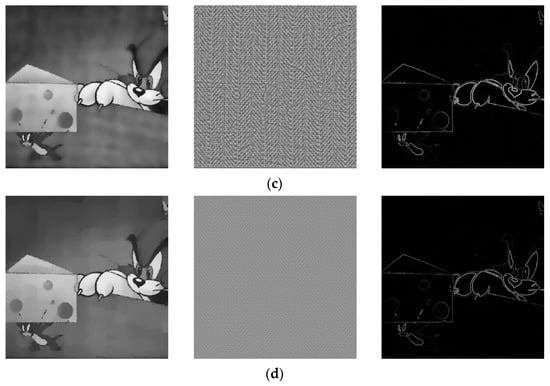 Tom decomposition experiment. From left to right: (a) cartoon, texture and the pseudo edge with [39]; (b) cartoon, texture and the pseudo edge with [40]; (c) cartoon, texture and the pseudo edge with [11]; (d) cartoon, texture and the pseudo edge obtained by the proposed method.