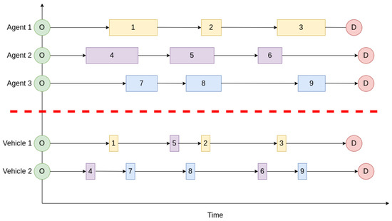 The industrial world today is characterized by much more complex systems and machines than in the past [1]. Companies are increasingly investing in integrating complex systems to boost their productivity and efficiency to gain an edge over their competitors. Hence, in modern companies, it is easy to see automated storage and retrieval systems (AV/RS) [2,3], automated guided vehicles (AGVs) [4,5], advanced software for transports optimization or production scheduling, and complex software architectures with a high level of parallelism. A similar process happened in cities, hospitals, airports and everyday services, where it is more and more common to see activities like car-sharing [6], bike-sharing [7], ride-sharing [8], short-term rental, and advanced management of personnel and flights [9]. These are all examples of real systems with a high degree of dynamism that require a good level of organization between different events and continuous process optimization. Figure 1 shows an illustrative example of a dynamic optimization problem with synchronization issues. A total of three agents, initially located at an origin depot (O), have to visit a series of locations (numbered from 1 to 9) and then return to a destination depot (D). In order to move around the system, these agents employ a ride-sharing service provided by two vehicles. The box size associated with each location corresponds to the time each agent or vehicle spends at that location. In the solution depicted in this figure, vehicle 1 drives agent 1 to location 1, then takes agent 2 to location 5, and then drives agent 1 to locations 2 and 3 before leaving this agent at D. Similarly, vehicle 2 will drive agent 2 to location 4, then agent 3 to locations 7 and 8, then agent 2 again to location 6, agent 3 to location 9, and finally agents 2 and 3 to D. Of course, in order for this solution to be feasible, we need to make sure that the vehicles can complete the assigned tasks on time (synchronization issue), which might depend upon which locations are assigned to each agent and which vehicle is assigned to each trip. Here, a goal such as finding a feasible solution that minimizes the total time invested in completing all the routing processes (makespan) could be considered, and many alternative solutions could be tested for feasibility and makespan value.