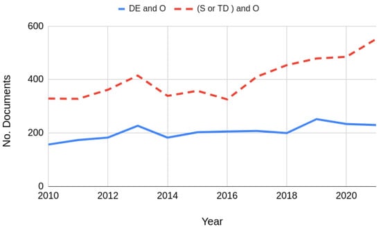 Figure 2 shows the evolution, over the last decade, in the number of Scopus-indexed documents referred to the following searching terms: (i) ‘TITLE-ABS-KEY ((synchronization OR time dependencies) AND optimization)’; and (ii) ‘TITLE-ABS-KEY ((discrete event) AND optimization)’. One can notice that the first search seems to provide an increasing trend over the years, while the second one seems to be more stable in time. As discussed in this paper, however, there is a lack of effective methods in the literature to solve dynamic optimization problems with synchronization issues, which can be certainly complex due to the time dependencies they generate.
