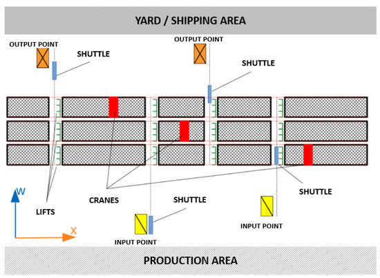 In this section, an illustrative example is described. We consider the application of a DEH algorithm to a shuttle–lift–crane based automated storage and retrieval system (SLC-AS/RS) [27]. The SLC-AS/RS is an automated warehouse frequently used in the steel industry, where it is generally dedicated to billets or metal bar bundles storage. The storage and retrieval operations involve three different types of machines: shuttles, lifts, and cranes. Each machine is autonomous, but it has to cooperate with other machines. Because of this requirement, the system is characterized by a high degree of synchronization in the tasks of the machines. An accurate description of an SLC-AS/RS is provided in Zammori et al. [28], Bertolini et al. [29] and Neroni [27], who provide a good description of the system elements (Figure 5).