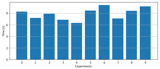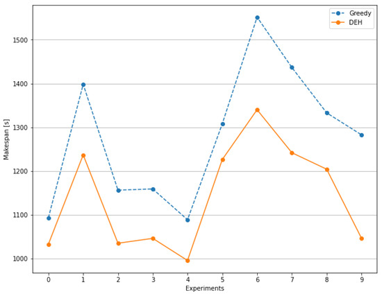 It is important to point out that using the DES provides the framework with many further benefits in terms of flexibility and simplicity. First, it would be possible to consider aspects that are typical in a real-world scenario (e.g., machine downtimes and failures). Secondly, the DES could be extended into a simheuristic approach through the introduction of stochastic operations with only slight changes in the overall framework. Finally, the simulation may provide additional information to define if a solution is better than another, such as the overall machine waiting time, the length of queues, etc. In Figure 6, the results of the BR-DEH algorithm are compared to the ones provided by a simple greedy heuristic. The results are expressed in terms of the makespan needed to carry out 20 storage and retrieval requests (hence, lower is better). The SLC-AS/RS used for in the example is the one presented in Figure 5. It consists of two shuttles exclusively dedicated to input operations, two shuttles dedicated to output operations, three cranes (one on each storage rack), and 12 lifts. Results in Figure 6 show the efficiency of the BR-DEH, and the computational times displayed in Figure 7 prove that this approach can be implemented in a real-life scenario.