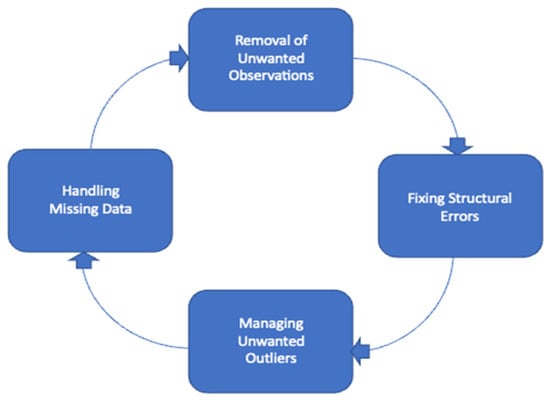Data cleaning is an essential step before training the model as it provides various benefits. Data cleaning removes any incorrect or inconsistent information that improves data quality. Figure 1 shows the common steps performed in data cleaning. It includes the removal of unwanted observations followed by correcting any structural errors that the observations in the dataset might have. The notion of “structural error” indicates any irregularities with the structure of the sentence such as typos in the name of features, the same attribute with a different name, mislabeled classes, additional spaces, and newline characters. The next steps are performed with an aim to manage unwanted outliers such as additional spaces, which is followed by handling any missing data in the dataset. The detailed steps performed for data cleaning are mentioned below [].