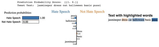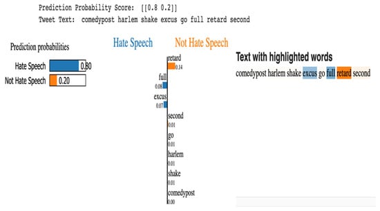LIME is an acronym for local interpretable model—agnostic explanations. Each portion of the name represents something we want to be able to explain. Local fidelity refers to the need for the explanation to accurately reflect the classifier’s behavior “around” the instance being predicted. This explanation is pointless unless it is interpretable, i.e., if it can be understood by a person. LIME is an agnostic model as it is capable of giving explanations for the predictions of a supervised learning model. LIME can be used with all types of data, be it text, images, or videos. LIME provides local interpretable explanations by computing important features and attributes for a given data point. It works by providing weights to the data rows and, using feature selection techniques, it obtains the important features. LIME is especially successful in explainable artificial intelligence (XAI). It can also be applied to all types of data and in all domains. LIME is a concrete implementation of local surrogate models. Surrogate models are trained to approximate the prediction of underlying black box model. Methods such as SHAP (Shapley additive explanations), counterfactual explanations, and other language interpretability tools can be used to explain black-box models. However, the reason for using LIME is that it uses Lasso or short trees, which results in explanations being selective and concise, thus representing more human-friendly explanations. In social media arbitration, the recipient of explanations is often a layman or someone with very little time. Figure 3 shows an example of explanation by LIME [].