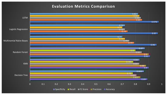 The results of all the models on the Google Jigsaw dataset, evaluated in terms of their accuracy, precision, and macro F1-score, are shown in Figure 4. Table 5 gives the scores of the evaluation metrics. It can be observed that LSTM was the best-performing model with an accuracy of 97.6%, closely followed by multinomial naïve Bayes with an accuracy of 96% and logistic regression with an accuracy of 97%. Random forest showed the highest precision of 90%, followed by the KNN classifier with a precision of 88%.