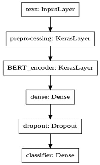 As shown in Figure 5, the architecture of the BERT + MLP model was fine-tuned in order to achieve the most efficient performance. The model contained one input and preprocessing layer, along with the BERT encoder, which was a keras layer. A dense layer was used after the keras layer to reduce the parameters and increase the number of features being propagated to the next layer. A dropout later was added to avoid overfitting of the model, followed by one dense layer used to represent the results as a classification problem. The model defined above was then compiled with the loss function as sparse categorical cross-entropy and the Adam optimizer.