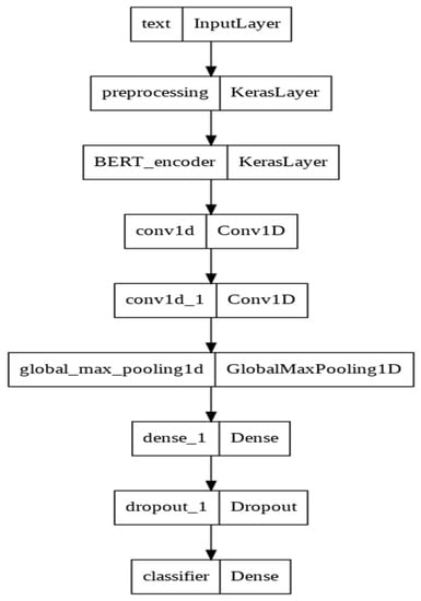 As shown in Figure 6, the architecture of the BERT + ANN model was fine-tuned in order to achieve the most efficient performance. The model contained one input and preprocessing layer, along with the BERT encoder, which was a keras layer. BERT was combined with convolution layers, followed by a 1D global max-pooling layer, which computed the maximum of all the input sizes for each of the input channels. A dense layer was introduced after the 1D global max-pooling layer to reduce the parameters and increase the number of features being propagated to the next layer. In the end, a dropout later was added to avoid overfitting, followed by a dense layer. The model defined above was then compiled with the loss function as sparse categorical cross-entropy and the Adam optimizer.