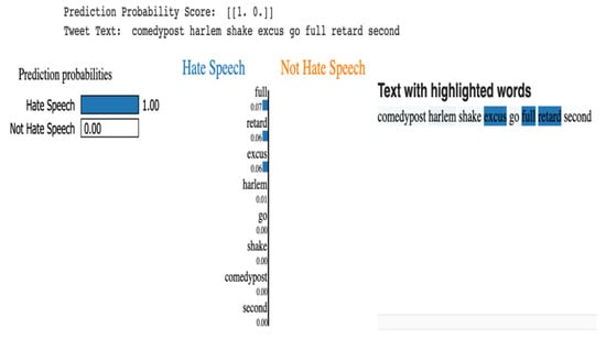 Figure 9 shows the explainability with LIME and decision tree for the example tweet. It can be observed that the LIME explainer gave weights to each useful word in the comment to indicate its importance in the overall decision making. From Figure 9, we can see that words such as “full”, “excus”, and “retard” had the highest weights in contributing to the overall prediction probability at 0.07, 0.06, and 0.06, respectively. The decision tree classifier did not give weight to predict the comment as non-hate speech for any of the words. We can see the trend in the text with highlighted words. The overall prediction probability for hate speech was 100% using the decision tree classifier.